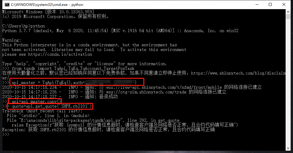 老师您好,我今天升级到2.0.4版本了。这个问题仍然存在。api_master.copy()无法使用get_quote(‘symbol’)方法,显示‘获取行情信息超时,请检查客户端及网络是否正常’。