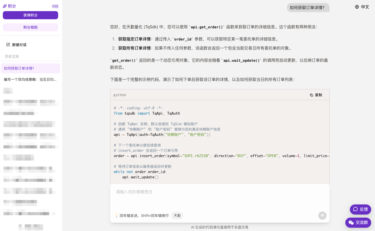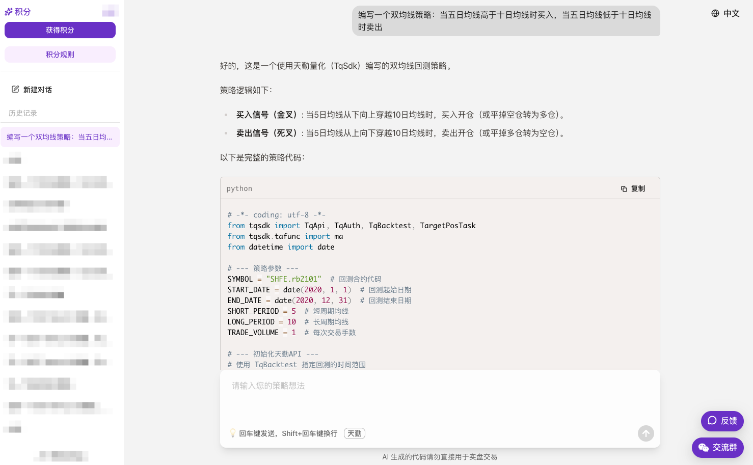 最近使用 AI 自动生成天勤的量化策略代码,效果出乎意料地不错。